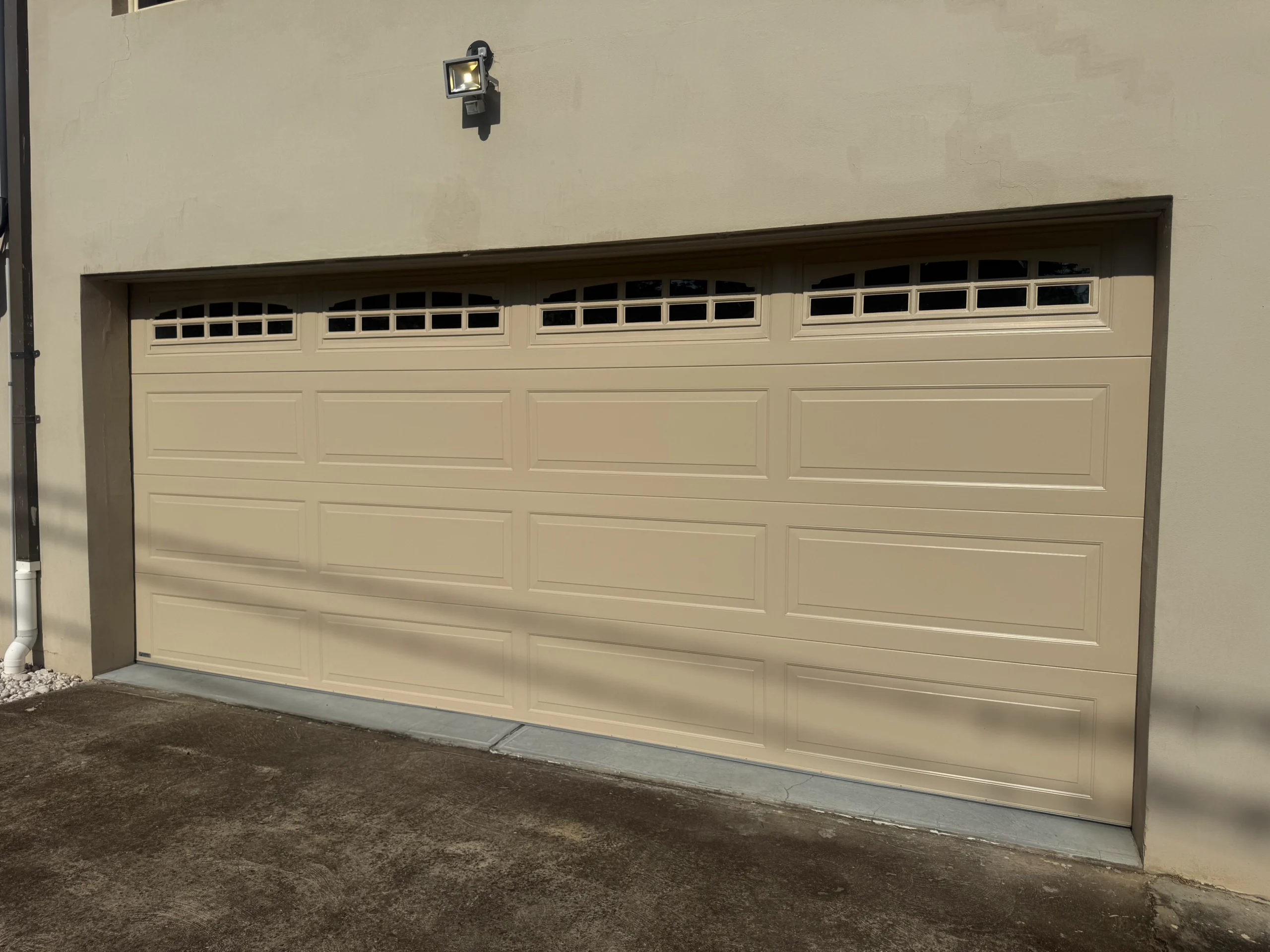 Paperbark Hampton Smooth sectional doors with cascade double windows Leave a Comment / Sectional Doors / By AussieGarageDoors Gliderol Panel Lift Garage Door. Paperbark Color Hampton Design Smooth Finish. Cascade Double Windows Head panel Merlin Ms105 Garage Opener / Motor